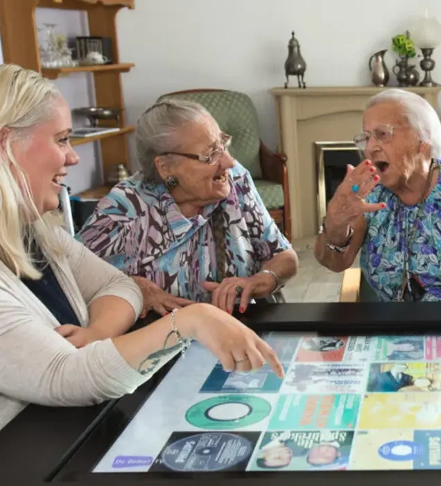 De BeleefTV is een grote, interactieve, mobiele activiteitentafel. Het spelen van stimulerende spelletjes, het luisteren van muziek en het ophalen van herinneringen brengt de bewoners van zorginstellingen dichter bij elkaar en hun omgevin