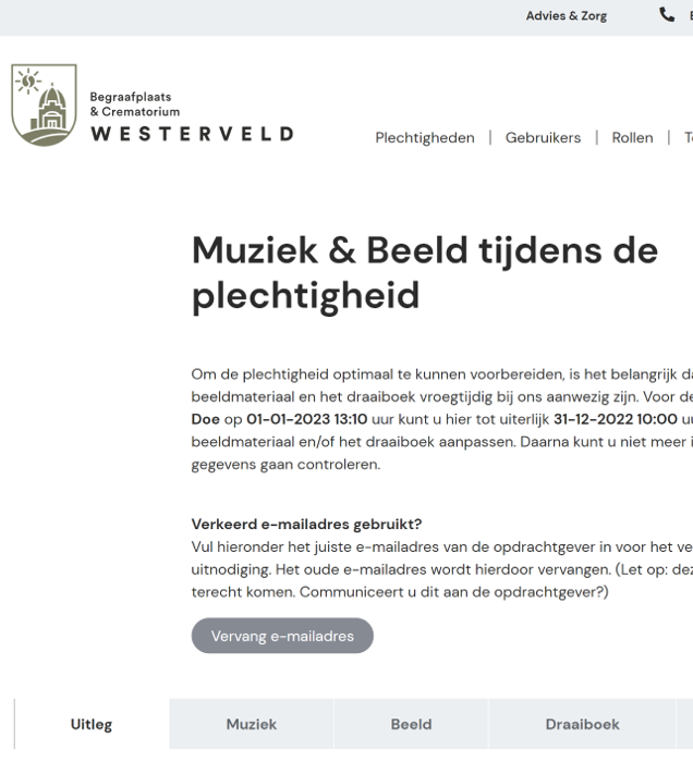 Realisatie Plechtigheidsmodule voor begraafplaatsen en crematoria. Nabestaanden krijgen toegang tot een beveiligde portaal waarbinnen de media zoals muziek en beeld voor de uitvaart kan worden samengesteld.