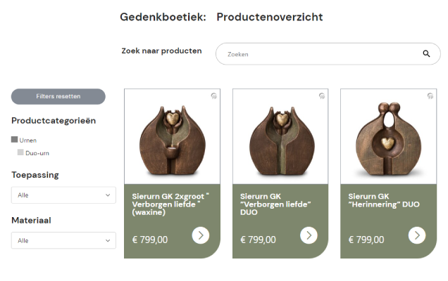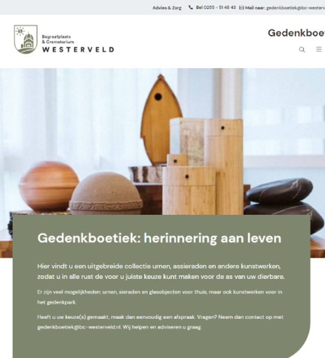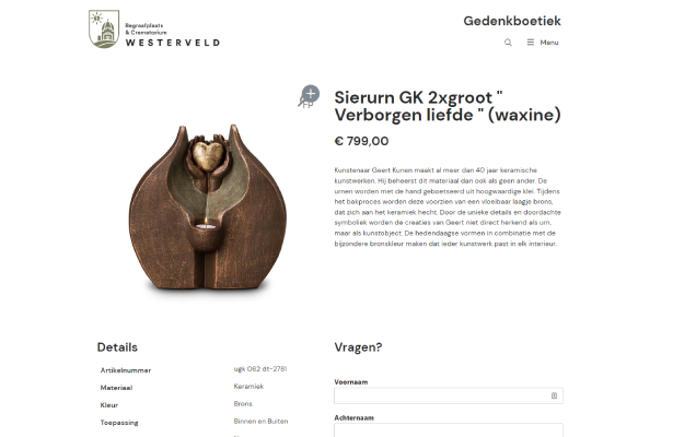 Realisatie gedenkboetiek webshops in samenwerking met Onze Kapel voor de vormgeving, voor de presentatie van een uitgebreide collectie urnen, assieraden en andere kunstwerken.