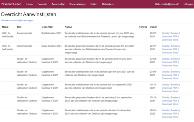 Realisatie portaal voor het genereren van aanwinstlijsten in opgemaakte Pdf en Word documenten op basis van aangeleverde csv bestanden.